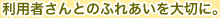 | コミュニケーション | 積極的に声をかけて、心を和ませます。敬語を使うなど会話にも気をつけましょう! | |